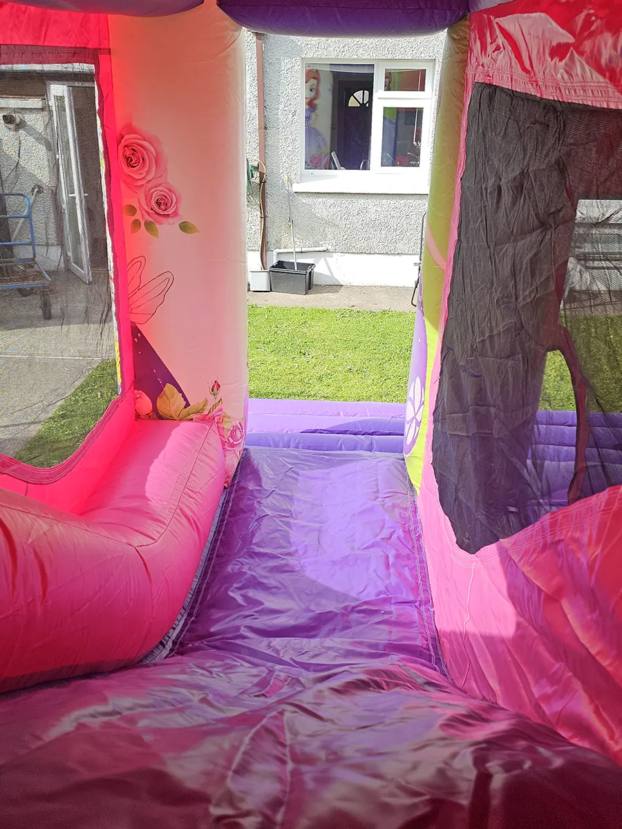 A stunning princess-themed bouncy castle hire in North Cork option that combines a large bouncing area with an exciting built-in slide. A favourite for birthday parties and communions in Midleton and Cobh, this unit offers extra space and eye-catching artwork that children love. Complete with rain cover and safety netting for peace of mind.