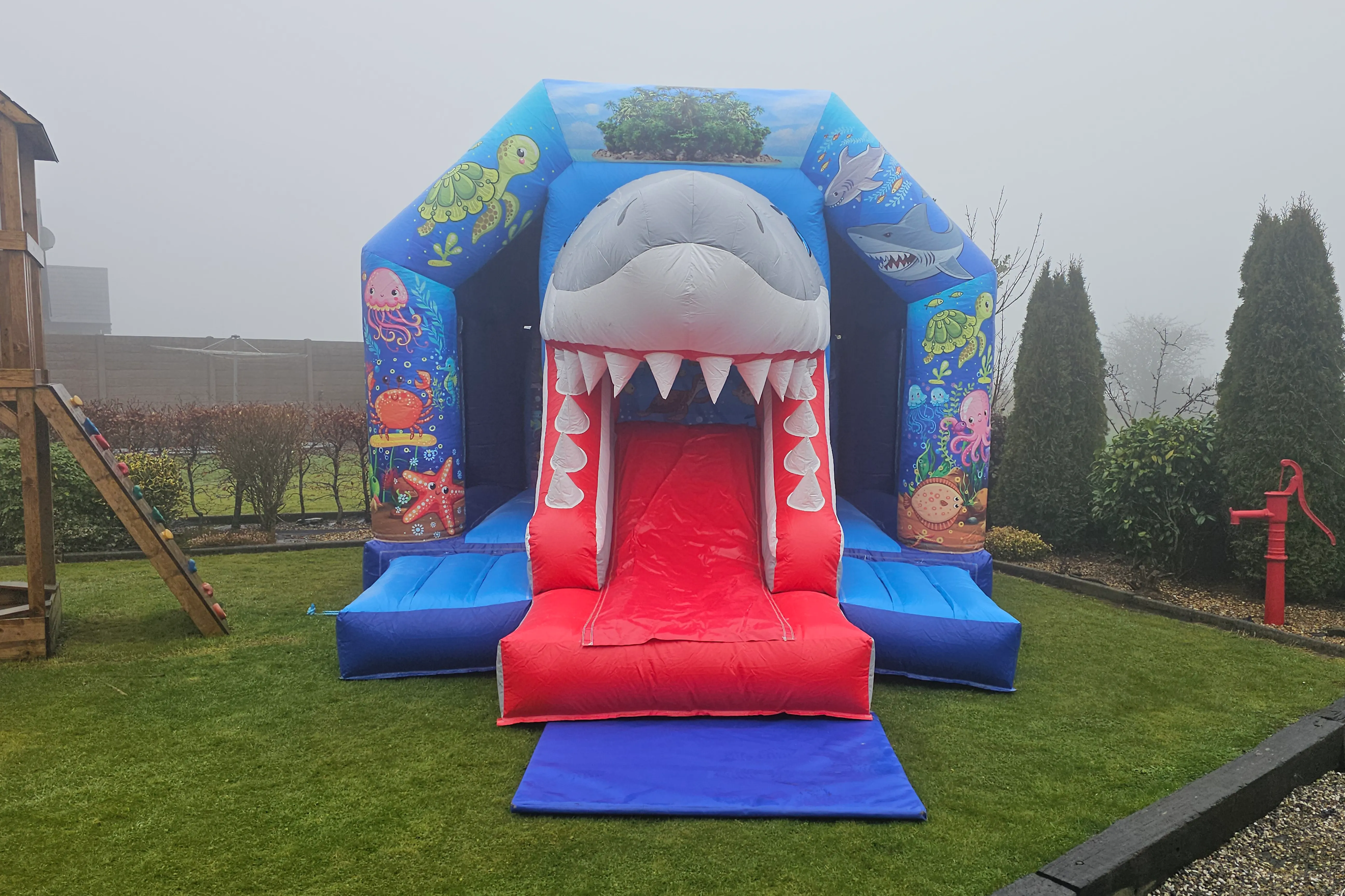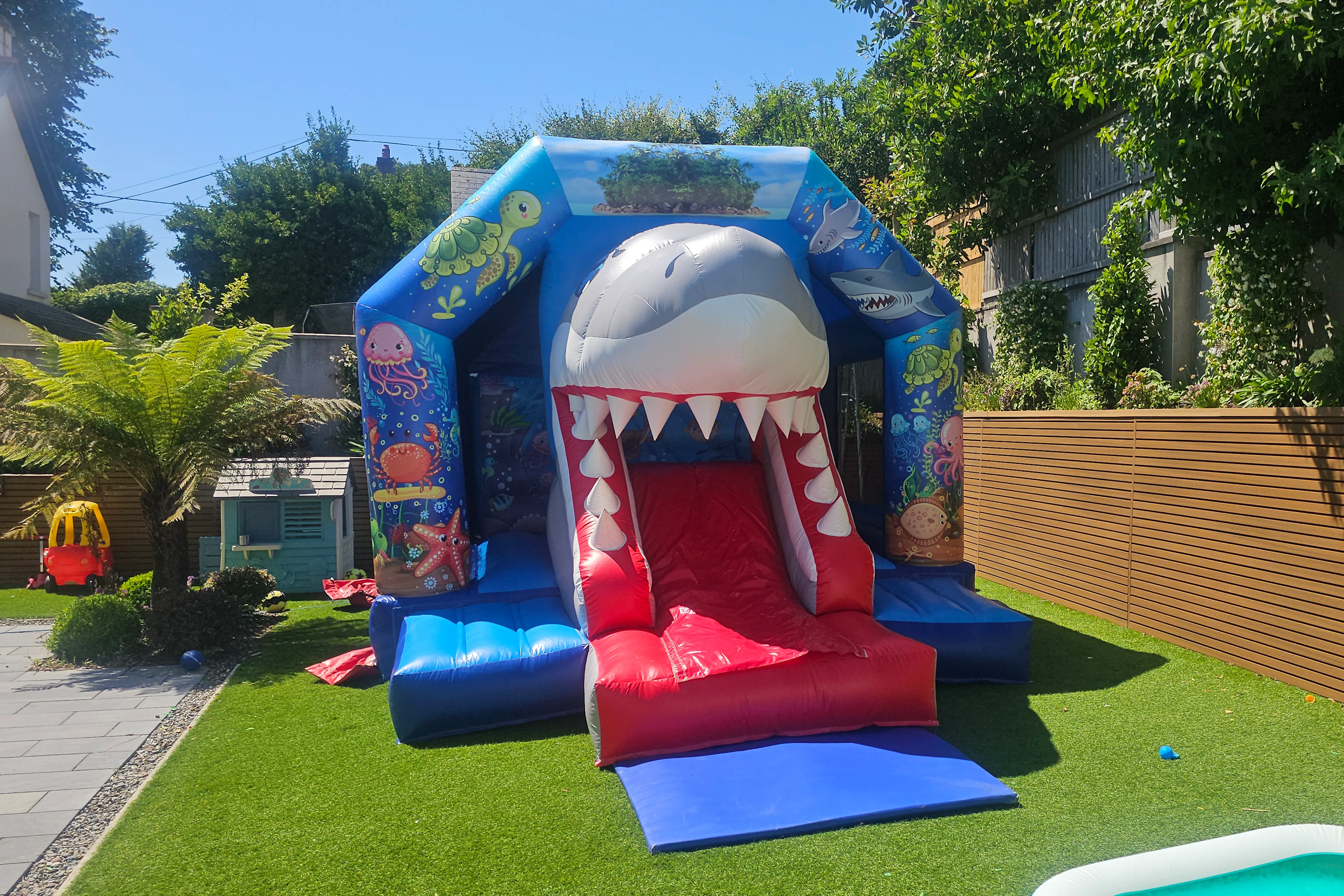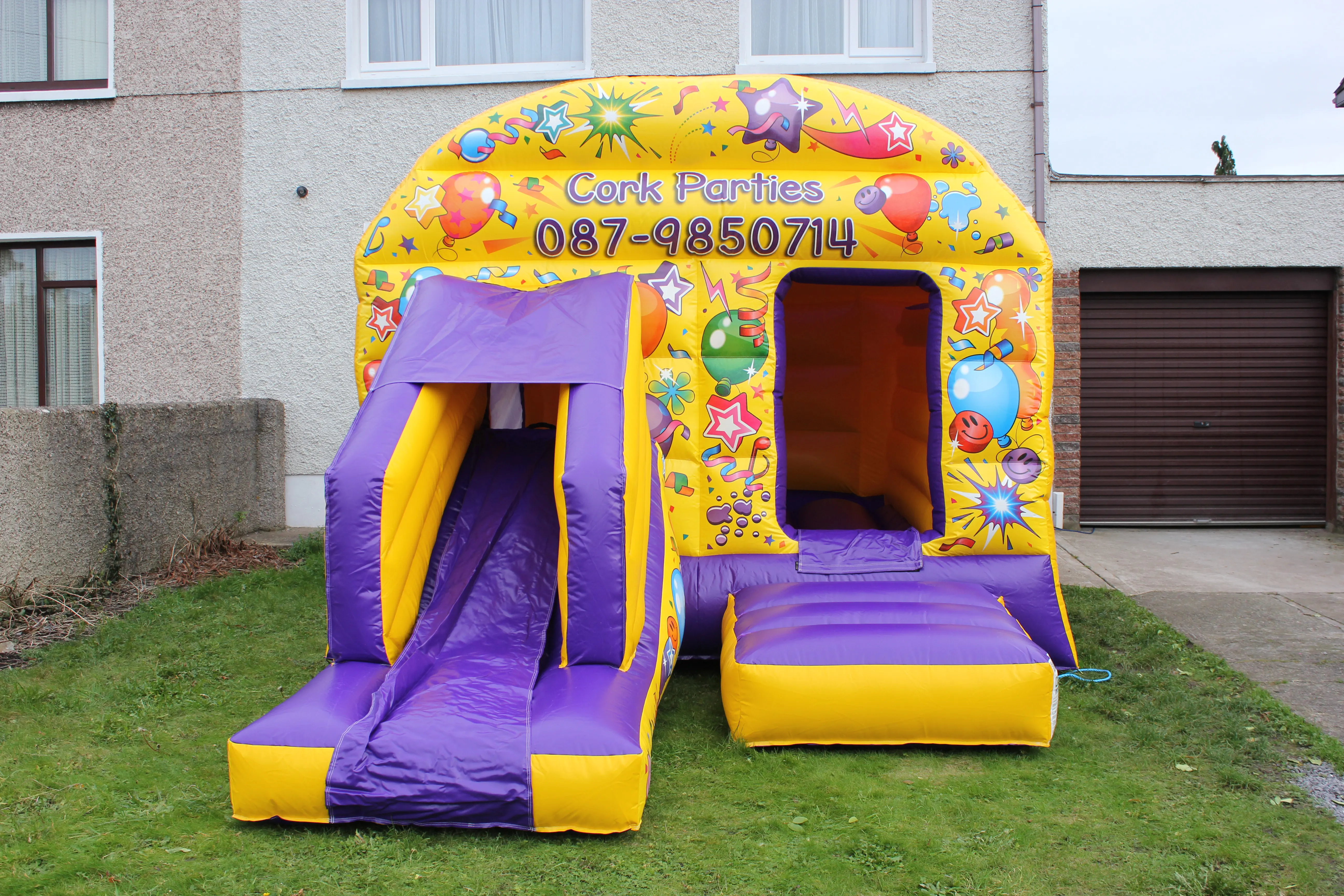 A narrow-access friendly inflatable perfect for homes in built-up areas such as Mallow town centre and Buttevant. Compact footprint with integrated slide and rain protection.