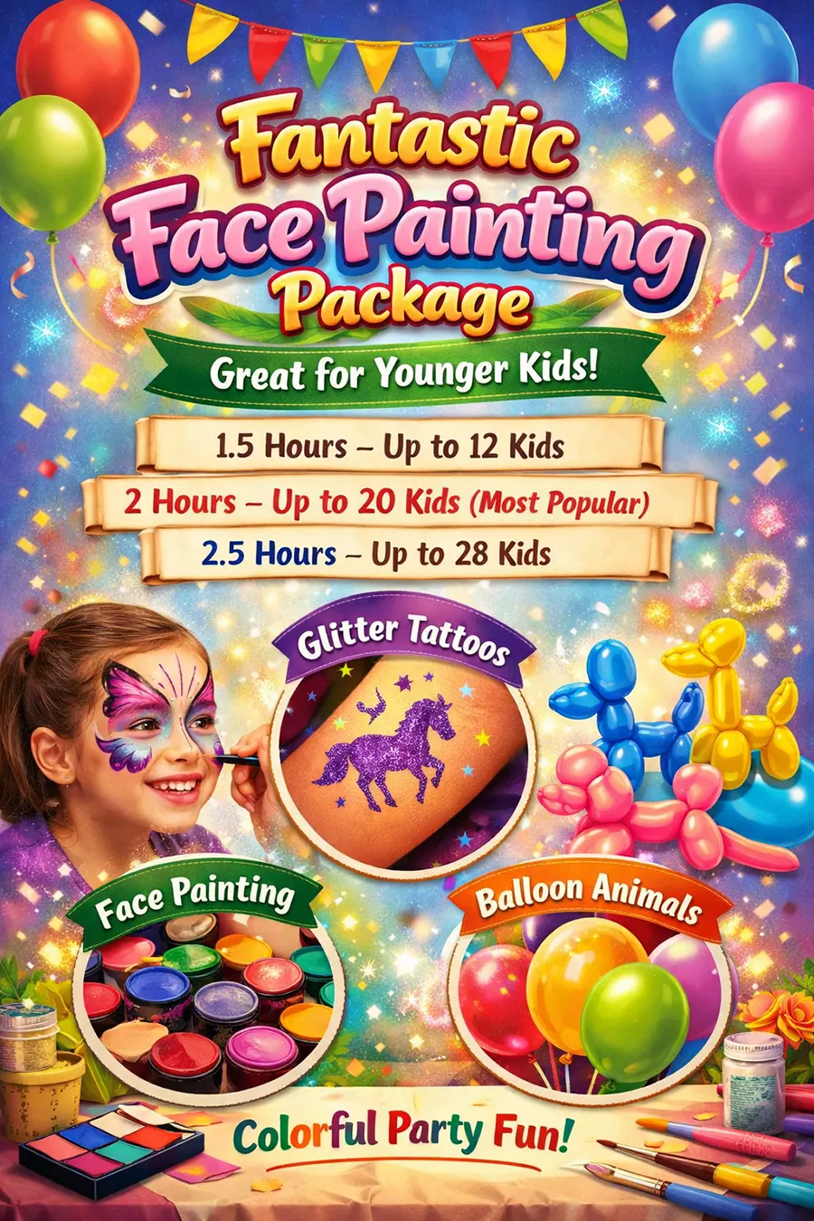A colourful, creative party option that kids adore. Each child takes approximately 5–10 minutes.