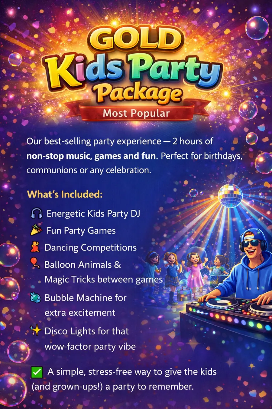 Ideal for halls and indoor venues — we take control of the party so parents can relax and enjoy the celebration.